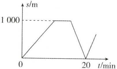 $ 100 $ $ 2000 $ 解析:小边匀速去上学,由图可知妈妈出门追赶他时,两人之间的距离不变,说明两人的速度相同.由图可知,小边和妈妈两人相距的距离 $ s $ 最大为 $ 1000 \, \text{m} $,两人相向而行到相遇共用 $ 5 \, \text{min} $,则小边的速度 $ v = \frac{\frac{1}{2}s}{t} = \frac{\frac{1}{2} \times 1000 \, \text{m}}{5 \, \text{min}} = 100 \, \text{m/min} $.由图可知,妈妈刚出门时,小边与妈妈相距 $ 1000 \, \text{m} $,即此刻小边离家 $ 1000 \, \text{m} $.妈妈出门 $ 5 \, \text{min} $ 时,小边继续向前走 $ 5 \, \text{min} $,向前运动 $ 500 \, \text{m} $,此时小边离家 $ 1500 \, \text{m} $.当小边也立刻以相同的速度原路回家,又过了 $ 5 \, \text{min} $ 他们相遇,小边向回家的方向运动 $ 500 \, \text{m} $,此时小边离家 $ 1000 \, \text{m} $.妈妈从相遇点回到家需要 $ 10 \, \text{min} $,小边在这 $ 10 \, \text{min} $ 向前运动的距离为 $ 1000 \, \text{m} $,则妈妈回到家时小边离家的距离为 $ 1000 \, \text{m} + 1000 \, \text{m} = 2000 \, \text{m} $.