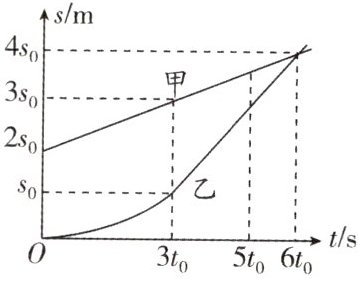 8. 甲、乙两车沿同一条平直马路同向前行,甲速度恒为4m/s,乙车从零开始加速,3t₀后做匀速直线运动,两车运动的s-t图像如图所示.在5t₀时,两车之间的距离刚好为16m.下列说法正确的是 (