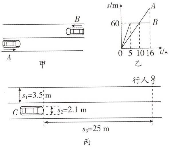 (3)如图丙所示,马路为双向两车道,每一条道均为3.5m宽,以5m/s速度做匀速直线运动的小车C正前方25m处一行人正开始横穿马路,行人也做匀速直线运动,小车车长为5m(小车可看成一个长方体),小车C始终行驶在该车道的中间;为了能够安全通过,行人速度v的范围是多少?