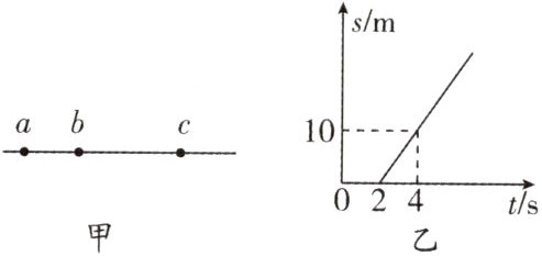 5 87 47 解析:由图乙可知,2~4 s,A 物体通过的路程为 10 m,且做匀速直线运动,则 2 s 后 A 物体的速度为 $ v_A = \frac{s}{t} = \frac{10\ \text{m}}{4\ \text{s} - 2\ \text{s}} = 5\ \text{m/s} $, 由图丙可知,前 2 s 物体 C 通过的路程为 3 m,2 s 后以 3 m/s 的速度做匀速直线运动,10 s 后 C 物体运动路程为 $ s_C = 3\ \text{m} + 3\ \text{m/s} \times (10\ \text{s} - 2\ \text{s}) = 27\ \text{m} $, 开始计时 10 s 后,物体 C 与 a 点之间距离为 80 m + 27 m = 107 m,物体 A 向右运动了 40 m, 若物体 B 往左运动,则开始计时 10 s 后,物体 B 向左运动 10 m,与 a 点之间距离为 30 m - 10 m = 20 m, 此时 B、C 两物体之间距离为 107 m - 20 m = 87 m, 若物体 B 往右运动,则开始计时 10 s 后,物体 B 向右运动 30 m,与 a 点之间距离为 30 m + 30 m = 60 m, 此时 B、C 两物体之间距离为 107 m - 60 m = 47 m, 所以开始计时 10 s 后,B、C 两物体可能相距 87 m 或 47 m.