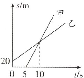 B 解析:A.由图像可知,甲、乙图线都是倾斜直线,故两车均在做匀速直线运动,故 A 错误;B.图像中乙车是在离计时位置 20 m 处出发,而甲车在乙车出发后 5 s 才出发,故两车出发前相距 20 m,甲比乙晚出发 5 s,故 B 正确;C.甲、乙两车在 10 s 时,甲车运动的路程大于乙车运动的路程,而甲车运动的时间小于乙车运动的时间,说明甲车的速度大于乙车的速度,故 C 错误;D.因为 5~10 s 内,甲的速度大于乙的速度,甲车在乙车的后方,说明乙车相对于甲车向西运动,故 D 错误.故选 B.