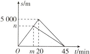 D 解析:A.两人同行过程中的速度为 $ v = \frac{s}{t} = \frac{5000\ \text{m}}{20\ \text{min}} = \frac{5\ \text{km}}{\frac{20}{60}\ \text{h}} = 15\ \text{km/h} $, 故 A 错误;B. $ m $ 的值是 $ 20\ \text{min} - 5\ \text{min} = 15\ \text{min} $, $ n $ 的值是 $ n = 15\ \text{km/h} \times \frac{15}{60}\ \text{h} = 3.75\ \text{km} = 3750\ \text{m} $, 故 B 错误;C.妈妈返回的速度为 $ v_1 = \frac{s_1}{t_1} = \frac{n}{t_1} = \frac{3750\ \text{m}}{45\ \text{min} - m} = \frac{3750\ \text{m}}{45\ \text{min} - 15\ \text{min}} = 125\ \text{m/min} $, 小希开始返回时,与妈妈的距离为 $ \Delta s = 5000\ \text{m} - n + v_1 \times (20\ \text{min} - m) = 5000\ \text{m} - 3750\ \text{m} + 125\ \text{m/min} \times (20\ \text{min} - 15\ \text{min}) = 1875\ \text{m} $, 故 C 错误;D.小希返回的速度为 $ v_2 = \frac{s}{t_2} = \frac{5000\ \text{m}}{(45 - 20)\ \text{min}} = 200\ \text{m/min} $, 20~30 min,两人运动的距离差为 $ \Delta s' = (v_2 - v_1)t_3 = (200\ \text{m/min} - 125\ \text{m/min}) \times 10\ \text{min} = 750\ \text{m} $, 经过 30 min 时,两人相距 $ \Delta s'' = \Delta s - \Delta s' = 1875\ \text{m} - 750\ \text{m} = 1125\ \text{m} $, 故 D 正确.故选 D.