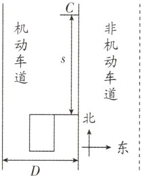 (3) 若司机驾驶车辆正在机动车道上由南向北匀速行驶, 已知机动车道的宽度 D 为 3 m, 轿车长度为 3 m、宽度为 1.8 m, 行驶速度为 36 km/h, 车辆行驶中始终位于机动车道的正中间. 如图, 某一时刻, 小蜀骑自行车在距离轿车正前方 s = 8 m 的 C 处横穿机动车道, 已知自行车长 1.6 m. 若司机没有采取任何措施, 则小蜀要先过公路, 骑车的速度至少是多大, 才能避免与车辆相撞?