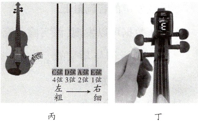(3)小明想到使用软件还可以给小提琴调音,他发现小提琴的琴弦如图丙所示,可以判断小提琴从左到右空弦(未按压弦时)的音调是____(填“由高到低”或“由低到高”),上网查询资料发现其 A 弦的空弦为标准音“la”,而测量出的频率为 411 Hz,此时应该____(填“拧紧”或“拧松”)琴弦对应的旋钮.
