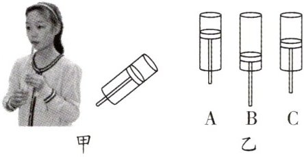 3. 小丽自己制作了一个哨子,在筷子上缠一些棉花,做成一个活塞.上下推拉活塞,可以改变声音的____(填“音调”“响度”或“音色”).如图乙所示,A、B、C 图活塞在管中不同位置时,用嘴吹管的上端能分别吹出“do(1)”“re(2)”“mi(3)”三个音阶,则 do(1)这个音阶与____图位置对应.