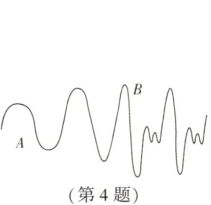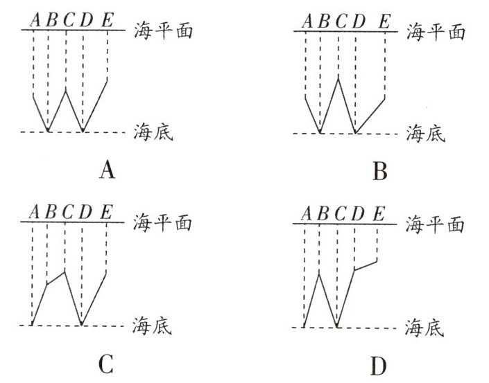 4. 一艘科考船对某海域的海底形状利用声呐系统进行了测绘.具体方法是:在经过该海域水平面的A、B、C、D、E五个位置时,向海底定向发射超声波,测得回收信号的时间分别为0.16s、0.30s、0.14s、0.30s、0.16s.根据时间,求出海底与海平面的距离,就可以绘出海底的大致形状,则该海域海底的大致形状如图中的 ()