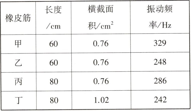 (1)为了探究橡皮筋发出声音的音调高低与橡皮筋粗细的关系,应选用只有横截面积不同的橡皮筋丙和橡皮筋丁进行对比实验,橡皮筋丁横截面积较大,振动频率较低,可得:长度和张紧程度相同时,橡皮筋越粗,发出声音的音调越低.