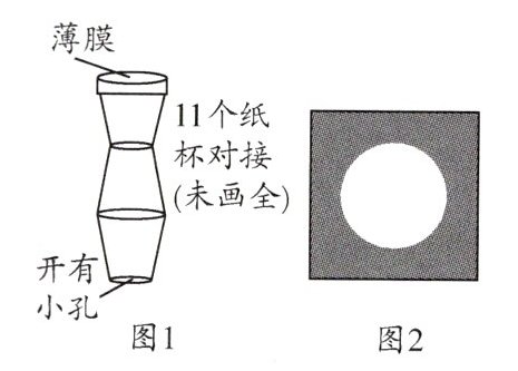 18. 正常天气情况下,看到的太阳为圆形时,小明想估测太阳直径D.他将11个相同的一次性纸杯对接起来,并将中间打通,前部戳一个小孔,尾部用半透明塑料薄膜套封住作为观察屏,制作了一个观察装置(如图1).将带小孔的一端正对着太阳方向,拍下此时观察屏的照片(如图2,与实际大小一致).设地球与太阳之间的距离为a.从小孔到观察屏的距离为L.以下有关数据可供选择性使用:地球与太阳之间的距离$a= 1.5×10^1^1 m;$杯口直径d= 80 mm;从小孔到观察屏的距离L= 1 m.