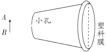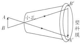 解析:A点发出的光经过小孔沿直线传播会在光屏上成像 $A'$,B点发出的光经过小孔沿直线传播会在光屏上成像 $B'$,连接 $A'B'$ 即为烛焰在塑料膜上成的像.