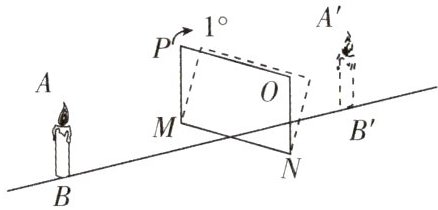 2. (2025·南京育英外国语月考)如图,蜡烛在平面镜MNOP前AB处,所成的像在位置$A'B'$处,现将平面镜以MN为轴,顺时针旋转$1^{\circ }$,那么蜡烛所成的像(