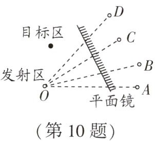 10. “小科学家”比赛中,有一个项目是“反弹击物”(如图),要求参赛者将皮球射到平面镜上,经平面镜反弹击中目标区内的物体.参赛者在发射区沿哪一方向射球,最有可能击中目标 ()