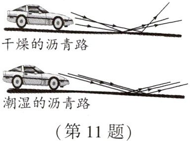 11. 如图是晚上汽车在干燥的沥青路面和潮湿的沥青路面上行驶时大灯部分光路简图,在晚上开车时 ()