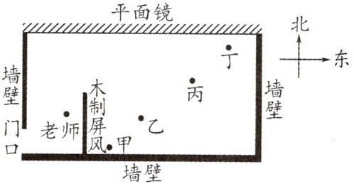 14. 如图所示是艺术体操训练房的俯视图,训练房的北墙有一大平面镜,当老师从室外进入到图示位置时,甲、乙、丙、丁四位同学能通过平面镜观察到老师的是 ()
