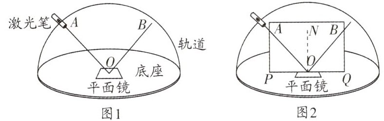 (2)多次改变激光笔在轨道上的位置,小红调整视角,均能观察到反射光OB挡住入射光AO的现象.如图2所示,将长方形纸板与AO、OB所在平面重合,其底边PQ紧贴平面镜,在纸板上即可显示出入射光和反射光.多次测量纸板和平面镜的夹角.