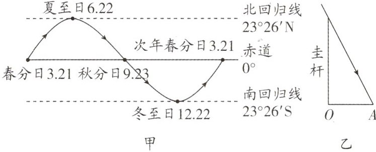 10. 新趋势 跨学科实践 (2024·盐城滨海县期中)太阳直射点的回归运动如图甲.2023 年 11 月 8 日(立冬),盐城(北纬 34°)某校实践活动小组将圭杆垂直插入水平地面进行“测影”活动,正午时刻杆影如图乙中的 OA.圭杆应是____(填“透明”或“不透明”)物体,图中杆影从 O 到 A 指向____方,今年冬至正午时刻的圭杆影长将比立冬日____(填“长”或“短”)一些.