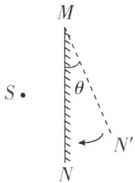 5. 如图,平面镜 MN 竖直放置,镜前有一个发光物体 S,此平面镜可绕垂直于纸面的水平轴 M 自由旋转,现将平面镜拉离竖直位置一个偏角 θ,至 MN'的位置时释放,在平面镜从 MN'摆动到 MN 位置过程中,物体 S 的像 S'()