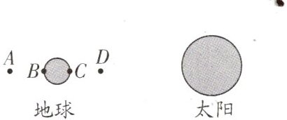 9. (2024·盐城阜宁县期中)在模拟日食的实验中,王老师画了太阳、地球和月球的位置示意图(如图),根据____规律判断月球在____(填“A”或“D”)处,地面上的观察者应该是位于____(填“B”或“C”)处可观察到日食.