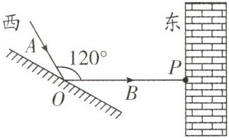 6. 如图所示,某日午后太阳发出的一条光线 AO,照射到一块平面镜上,反射光线沿水平方向 OB 射出,并在东侧的墙面形成一个光点 P,AO 与 OB 的夹角为 120°,以下说法错误的是()
