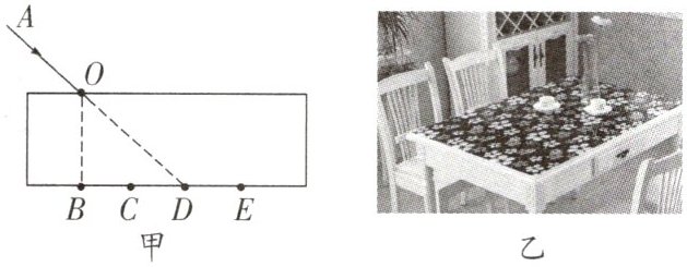 7. 如图甲所示,一束激光AO从空气斜射入玻璃砖,折射后从另一面射出,其出射点可能为______(填字母);若增大入射角,出射点会______(填“往左”“往右”或“不变”)移动.如图乙所示,为保护餐桌,往往在餐桌上放上玻璃垫,当我们吃饭时,看到桌子上的花纹会比实际花纹的位置______(填“高”“低”或“不变”).