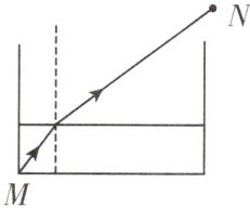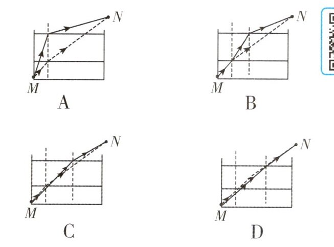 6. 如图是小明眼睛在N点看到鱼缸内M点处鹅卵石的光路图,鱼缸内注入更多水后,小明的眼睛在N点仍然可以看到鹅卵石.选项中带箭头的虚线代表原来的光路,能正确反映水变多后小明看到鹅卵石的光路图是 (