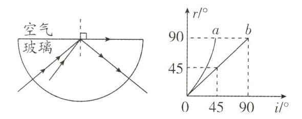 (3)光从玻璃斜射向空气时,折射角随着入射角的增大而增大,且折射角总大于入射角.图线a中的折射角始终大于入射角,且入射角接近$45^{\circ}$时,折射角达到$90^{\circ}$(即发生全反射),符合题意,因此图线a反映了折射角与入射角的关系.