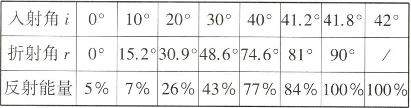 (2)根据表中数据可得,光从玻璃斜射向空气,当入射角$\geqslant 41.8^{\circ}$时,反射能量达到$100\%$,就发生了全反射现象.