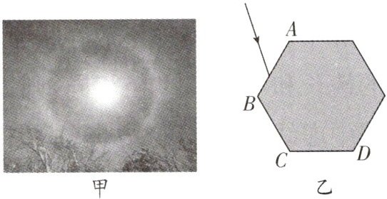 8. 如图甲是某博主在内蒙古拍摄的超大“幻月环”.“幻月环”是一种独特的大气现象,当月光透过高空云层时,经过云层中六棱冰晶的折射,便形成了这种壮观的环形光晕.如图乙,一束光从六棱冰晶的AB面射入,请在图中作出光经六棱冰晶折射后从CD面射出的大致光路.