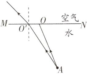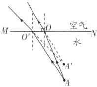 解析:先过折射点垂直界面作出法线,再在空气中法线的另一侧画出折射光线,注意入射角小于折射角,将两条折射光线反向延长,其交点即为人所看到的A点的像的位置A'.