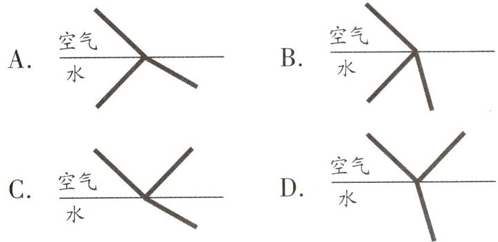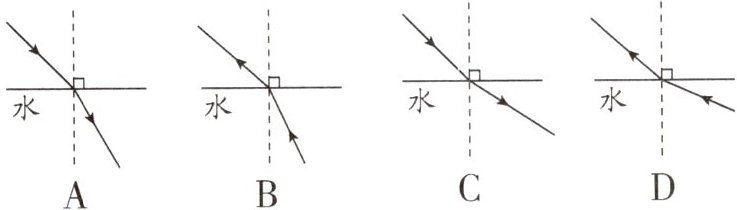 A 解析:竹篙水下部分反射的光线由水中进入空气时在水面上发生折射,折射角大于入射角,折射光线进入人眼,人眼逆着折射光线的方向看去就会觉得竹篙变浅了,同时水面相当于平面镜,所以会在水下形成竹篙水上部分的虚像,故A符合题意,BCD不符合题意.故选A.