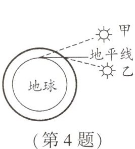 4. 诗句“大漠孤烟直,长河落日圆”给我们展现了一幅美丽的画卷.其实诗人观察到的落日并非太阳的实际位置(如图所示),而是太阳光经过不均匀的大气层发生了______所成的像,太阳实际在图中______(填“甲”或“乙”)的位置.