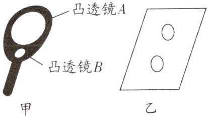 9. 新素材创新装置(2025·苏州六区期末)某放大镜由A、B两个凸透镜组成,如图甲所示.A的直径为D,B的直径为d,将它正对太阳光,把一张白纸放在它的下方,在白纸上得到了如图乙所示的两个直径均为d的圆斑.下列说法正确的是 ()