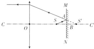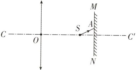 8. 如图,平面镜MN垂直于凸透镜的主光轴CC',点光源S位于主光轴上,光线SA经平面镜反射和透镜折射后与主光轴平行.已知S到透镜和平面镜的距离分别是10cm、4cm,则此透镜的焦距是 ()