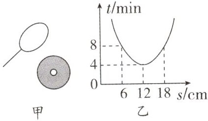 11. 小明想知道某块透镜的焦距,进行了如图甲所示的操作(镜面正对着太阳光,在透镜下面放上白纸,且透镜与白纸保持平行),测出透镜与白纸间距s与对应的白纸被烤焦的时间t,绘出图像乙,可判断该透镜的焦距为____cm;若某时刻白纸上所成圆形光斑的直径为透镜直径的一半,且使凸透镜稍远离白纸光斑变大,则此时透镜到白纸的距离