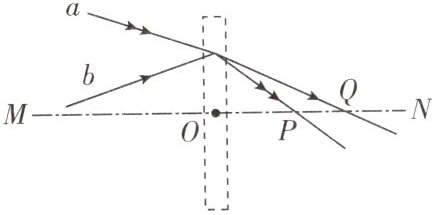 10. 如图所示,虚线框内为一透镜,MN为透镜的主光轴,O是透镜光心,a(双箭头)和b(单箭头)是射向透镜的两条光线.已知光线a通过透镜之后与MN交于P点,光线b通过透镜之后与MN交于Q点.该透镜是____透镜,焦距____(填“大于”“小于”或“等于”)OQ.
