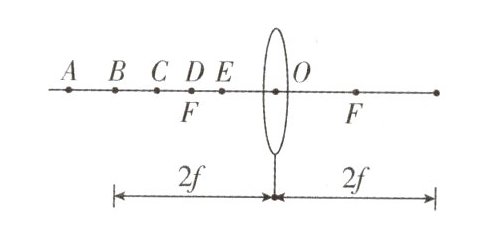 物体方向 6 A、B、C D、E 解析:由题可知,此时物距为18cm,像距为12cm,所以此时光屏上成倒立缩小的实像,根据光路的可逆性,当物距为12cm,像距为18cm时,光屏上成倒立放大的实像,所以应该将凸透镜向物体方向移动6cm.由凸透镜成像规律可知,当物体处在凸透镜一倍焦距以外时成倒立的像,即图中的A、B、C三点;当物体处在一倍焦距上或一倍焦距以内时,光屏上不能成像,即图中的D、E两点.