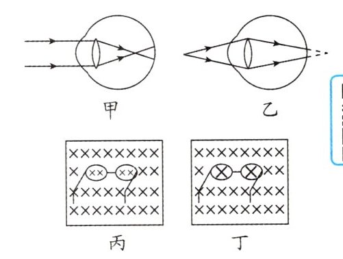 B. 甲图反映了远视眼的形成原因,需戴丁图中的眼镜对视力进行矫正