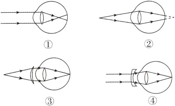 A 解析:近视眼成像在视网膜前,如图①所示;矫正近视眼的方法是戴凹透镜,使成像位置往后移动,如图④所示.故A符合题意.