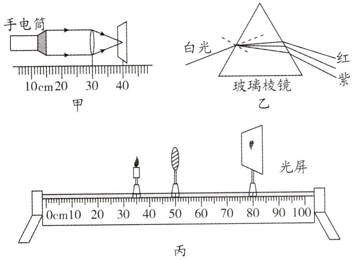 (2)小明联想到了光的色散实验如图乙,若换用紫色的光进行实验,所测焦距比利用红光照射所测的焦距____(填“偏大”或“偏小”).