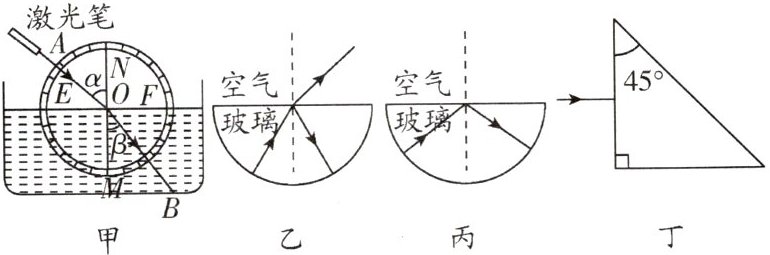 (4)让一束激光从某玻璃斜射向空气(图乙).当入射角增大到 41.8°时,折射光消失,只存在入射光与反射光,这种现象叫作光的全反射,如图丙所示,此时的入射角叫作这种物质的临界角.当入射角大于临界角时,只发生反射,不发生折射,根据以上内容可判断: