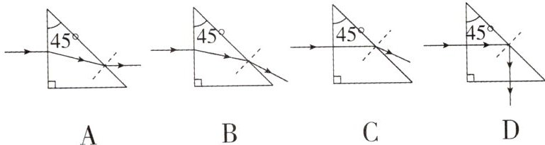 ②一个三棱镜由上述玻璃制成,一束光垂直于三棱镜的一个面射入,如图丁所示.则关于这束光经过三棱镜后的光路描述,下图中正确的是____.