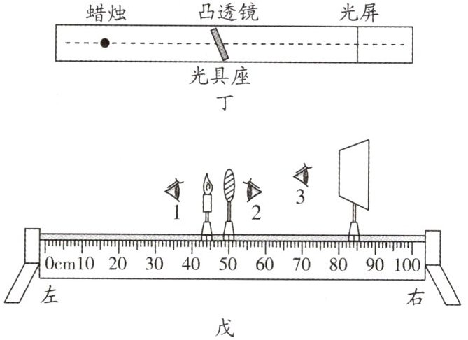 (4)人眼在图戊的 2 处观察,此时物距小于一倍焦距,成正立放大的虚像,即观察到的是图丙中的④像,此时有光线透过凸透镜进入人眼.