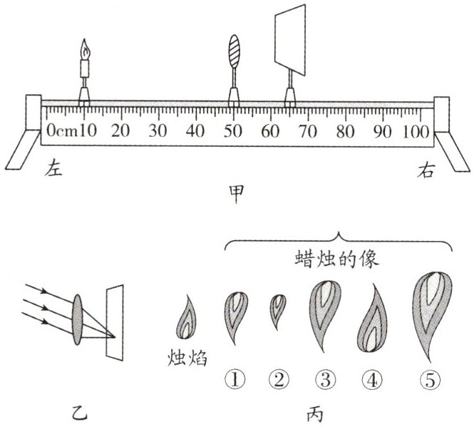 (1)平行于主光轴的光线经凸透镜折射后,会聚在主光轴上一点,这点是凸透镜的焦点,焦点到光心的距离是凸透镜的焦距.由图甲可知,刻度尺的分度值为 1 cm,所以凸透镜的焦距是$f=40.0cm - 30.0cm = 10.0cm$.