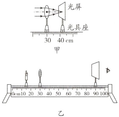 (1)如图甲所示,该凸透镜的焦距为______ $ \mathrm{cm} $;点燃蜡烛,调整凸透镜和光屏,使烛焰和光屏的中心位于______上。