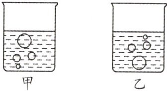 5. 在观察水的沸腾实验中,水沸腾时气泡上升的情况如图____(填“甲”或“乙”),气泡内的气体主要是____.实验中烧杯上加盖板的目的是____.