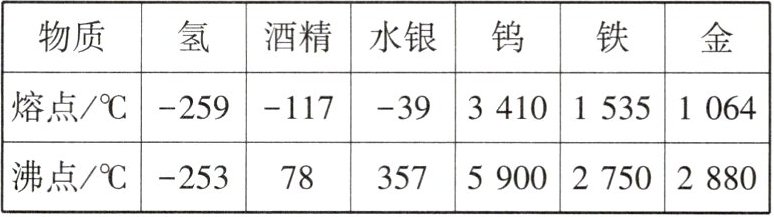D 解析:A.钨的熔点高,所以可以用来制作灯丝,故A错误;B.水银的熔点是-39℃,水银是晶体,在-39℃时,可能是固态、液态或固液共存态,故B错误;C.标准大气压下沸水温度高于酒精的沸点,所以不可以用酒精温度计测量标准大气压下沸水温度,故C错误;D.铁的熔点高于金的熔点,铁水的温度在1535℃到2750℃之间,高于金的熔点,所以金块掉入铁水中一定会熔化,故D正确.故选D.
