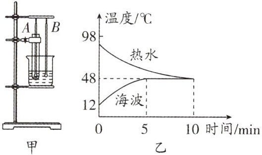 12. 如图甲所示,将海波放入大试管中,在烧杯中倒入热水.根据温度计A和B的示数,绘制出海波和热水的温度随时间变化的图像,如图乙所示.由图像可知,在第8min时,大试管内的海波处于____(填“固态”“液态”或“固液共存态”);第10min后,海波的熔化将____(填“停止”或“继续”).
