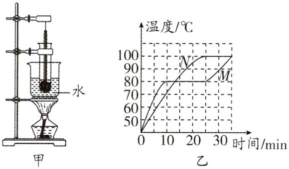 10. 两套完全相同的(如图甲所示)加热装置,两套装置的试管中分别装有少量的相等体积的M固体和N固体,它们的加热时间—温度曲线如图乙所示,在35min内M物质从固体熔化成了液体,N物质始终是固体,则下列说法正确的是 ()