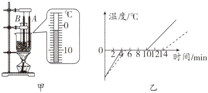 (2)实验过程中A、B两个温度计的示数随时间变化的图像如题图乙所示,烧杯中的冰先熔化,通过分析图像可知,虚线是试管内碎冰温度随时间变化的图像.
