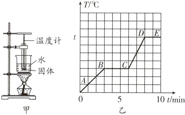 B 解析:A.因为在标准大气压下,水的沸点是$ 100^{\circ}C $,如果固体的熔点大于或等于$ 100^{\circ}C $,没法继续吸热,不能熔化,而图中BC段是熔化图像,说明固体熔点$ T_{1} $一定小于$ 100^{\circ}C $,故A正确;BC.如果该物质的沸点$ T_{2} $大于$ 100^{\circ}C $,则DE段是水达到了沸点,保持$ 100^{\circ}C $不变,试管中的液体也达到$ 100^{\circ}C $后不能继续吸热,温度保持$ 100^{\circ}C $不变,此时液态物质并未沸腾,故B错误,C正确;D.比较图像AB和CD段可以看出,在时间相同时,AB段温度升高慢,说明这种物质在固态升温慢,故D正确.故选B.