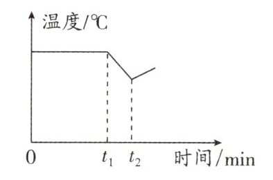 B 解析:A.题图显示的应该是萘从固液混合态慢慢冷却之后又加热的过程,并不是$ t_{1} $时刻停止加热,故A错误;B.在$ t_{1} \sim t_{2} $的时间内,温度降低,不断向外放出热量,故B正确;C.凝固过程中温度不变,故C错误;D.在$ 0 \sim t_{1} $时,温度为萘的凝固点和熔点,故D错误.故选B.